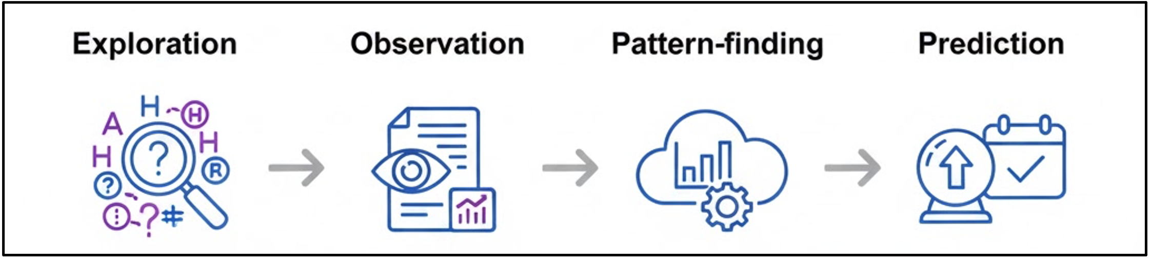 - Predicting outcomes translates observed patterns into insights, while recognising that all predictions carry uncertainty.