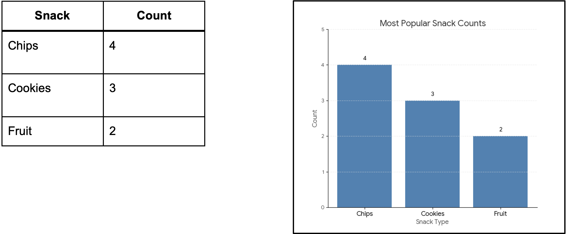 In a chart, you instantly see: Chips dominate. Cookies are next. Fruit lags behind.