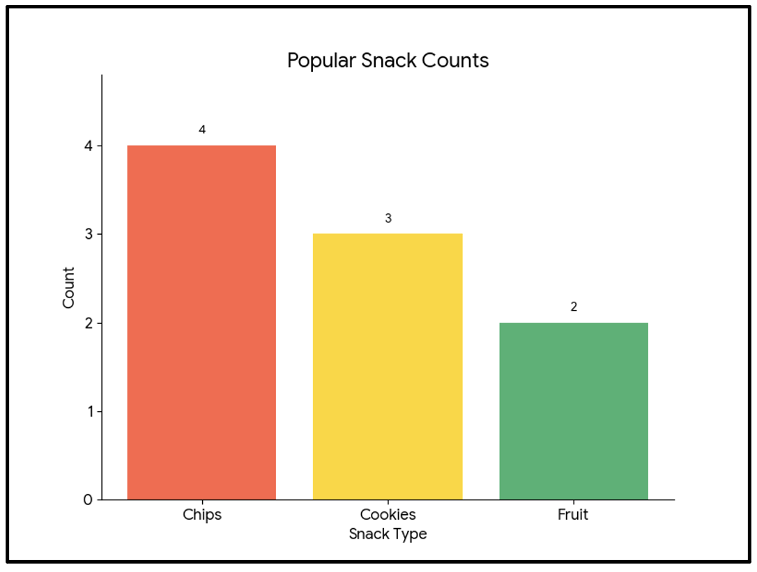 | Bar Chart | Comparison between distinct categories | Instantly ranks items and shows magnitudes (e.g., favourite snacks by frequency). |